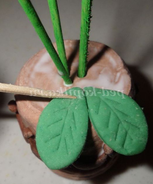 Намазуємо клеєм верх у вазочки і гострим кінцем до стеблах, викладаємо 8 листочків. Для кращого склеювання деталей натискаємо зверху паличкою.
