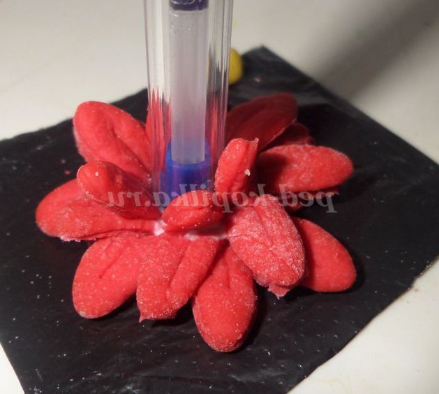 Середину квітки виконуємо з тіста жовтого кольору. Скачати кульку діаметром 3-5 см (можна використовувати бусинку). Поглиблення змащуємо клеєм і закріплюємо середину квітки.