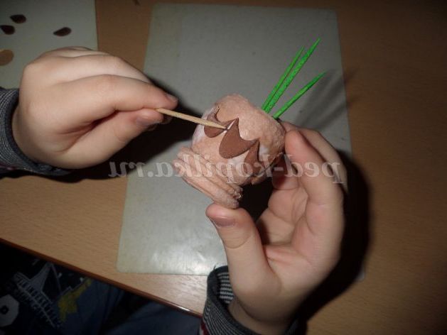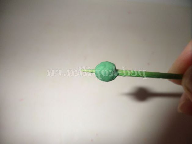 5. Квітка «одягають» на стебло. Для цього кінчик зубочисток-стебел намазують клеєм і наколюють на нього квітка. Квітка при цьому злегка вдавлюється в зелений - чашолисток.