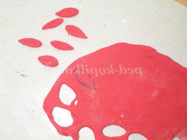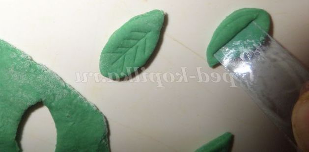3. Зелене тісто розкочуємо тонко (2 мм) і формочкою-листком вирізаємо 15 великих листочків і 2 маленьких. Лопаткою робимо прожилки у листочків.