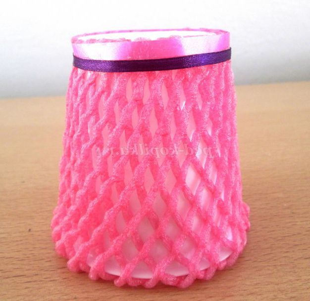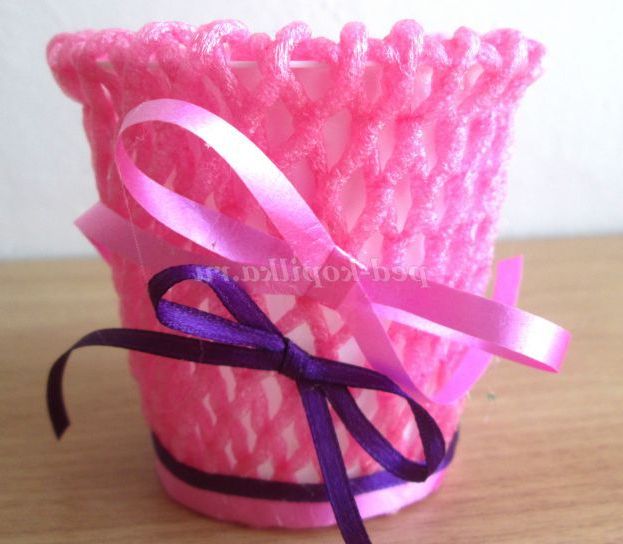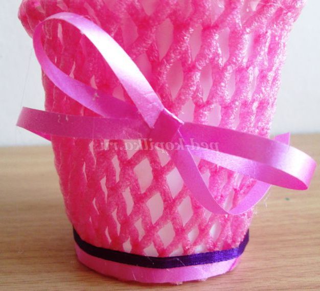 і приклеюємо клеєм «Майстер». Верхню частину сіточки приклеїти всередині стаканчика, нижній край відрізати. Низ вазочки прикрашаємо тонкими атласними стрічками.