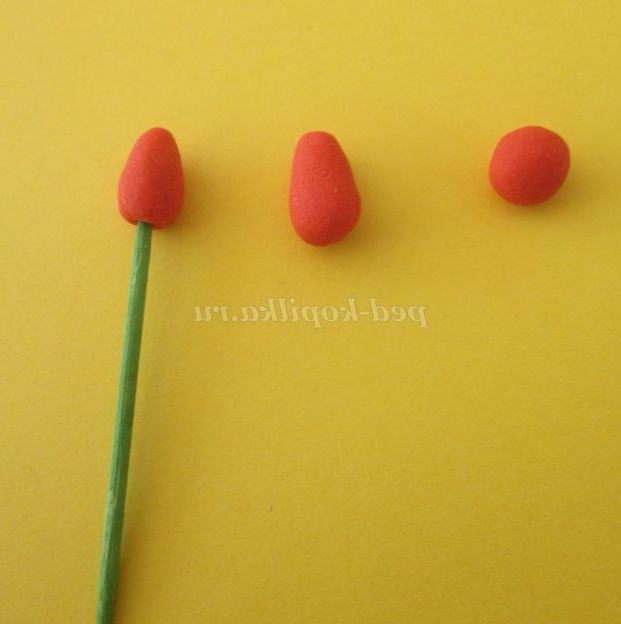2. Виготовлення тюльпанів. Беремо шматочок в діаметрі не більше сантиметра. І катаємо спочатку в краплю, а потім трохи витягуємо, роблячи краплю ось такий форми. Надіти крапельку на зубочистку (це будуть внутрішні листя квітки).