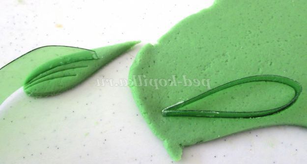 5. Зелене тісто розкочуємо тонко (2 мм) і формочкою-листком вирізаємо 18 листочків. Лопаткою робимо прожилки у листочків.