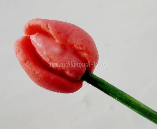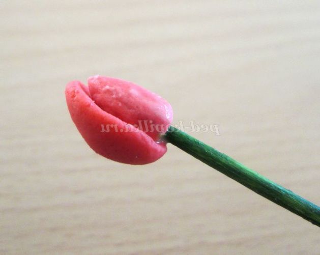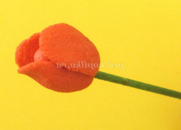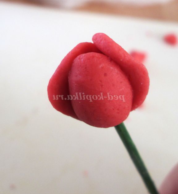 Далі скачати три кульки з червоного тесту. Кульки злегка закоткувати - вийде овоид, це пелюстка нашого тюльпана. Овоид кладемо на середину долоні і вказівним пальцем розплющуємо його. Прожилки на пелюстці виходять за рахунок ліній на долоні. Таких пелюсток для однієї квітки потрібно зробити 3 штуки. Приклеюємо спочатку один пелюстка,