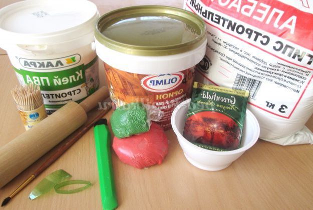1 частина борошна,1 частина солі (сіль обов'язково дрібна), клей ПВА - 1-1,5 столові ложки, вода, гуаш (червона, зелена). Гуаш розводимо у воді, тільки потім додаємо борошно. Кожний колір замішуємо окремо. Замішуємо круте тісто.