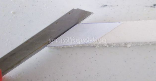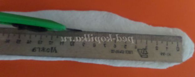 І з допомогою лінійки та канцелярського ножа нарізати смужки шириною 1 см і довжиною, рівній висоті нашої форми (у мене висота форми 7 см). Таких смуг потрібно 10 штук.