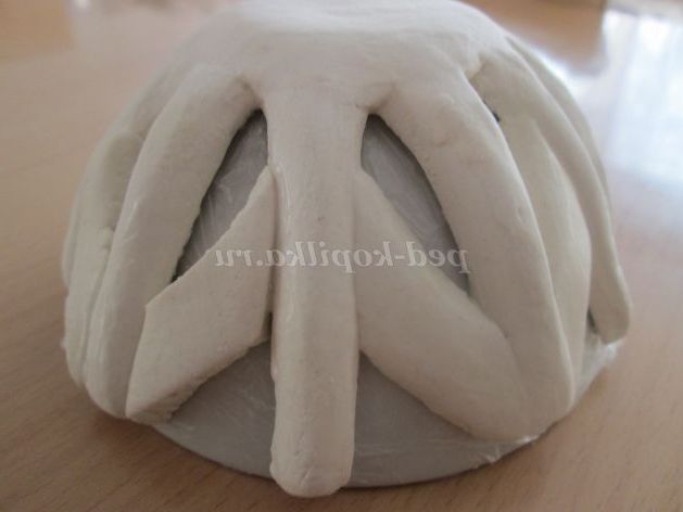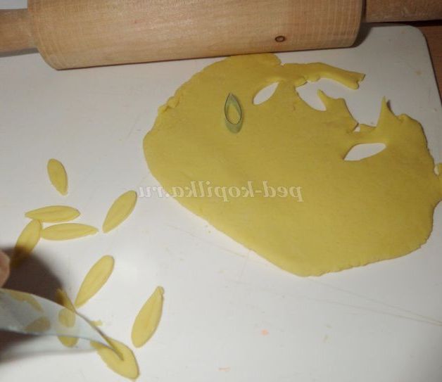 З зеленого тесту скачати короткі тоненькі ковбаски за кількістю листочків, закріпити їх у підстави листя.