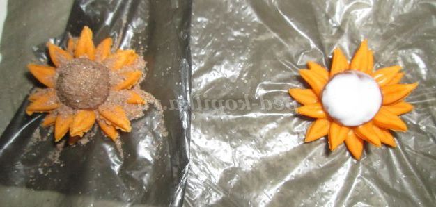 7. Клеєм ПВА змастити серединки у квітів, потім присипати піском. Дати час висохнути клею (близько 1 години). Зайвий пісок струсити.