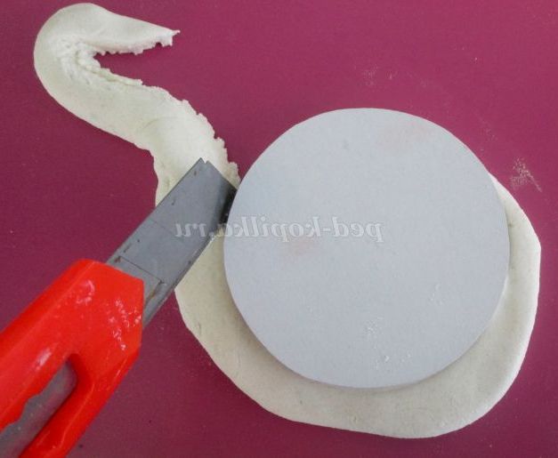 5. Акуратно видаляємо форму. З тіста білого кольору вирізаємо коло діаметром 5,5 см та товщиною 1см, це основне дно нашої конфетница.