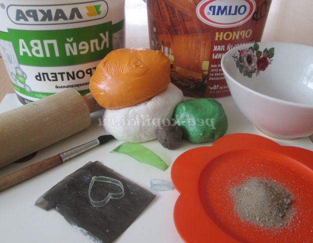 Матеріали:4 кольори солоного тіста - зелений, жовтий, коричневий, білий; клей ПВА; кисть; формочка-листок велика і маленька; лопаточка (можна користуватися і стеком); скалка; дошка для розкачування тіста; шматок харчової плівки; чашка (я використовувала піалу);6 шматочків плівки, 3 см на 3 см (можна відрізати від поліетиленового пакету), річковий пісок (пофарбований у коричневий колір); канцелярський ніж.