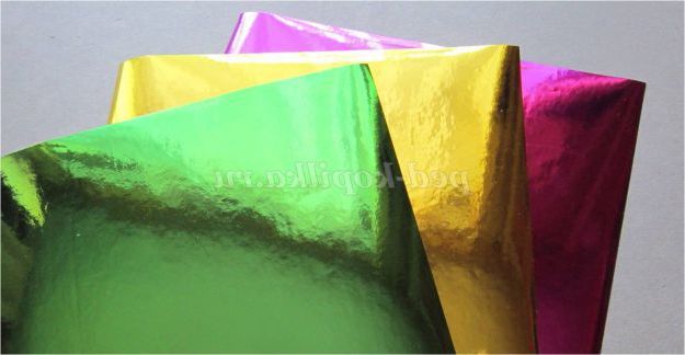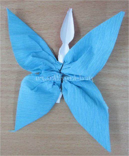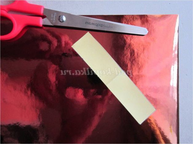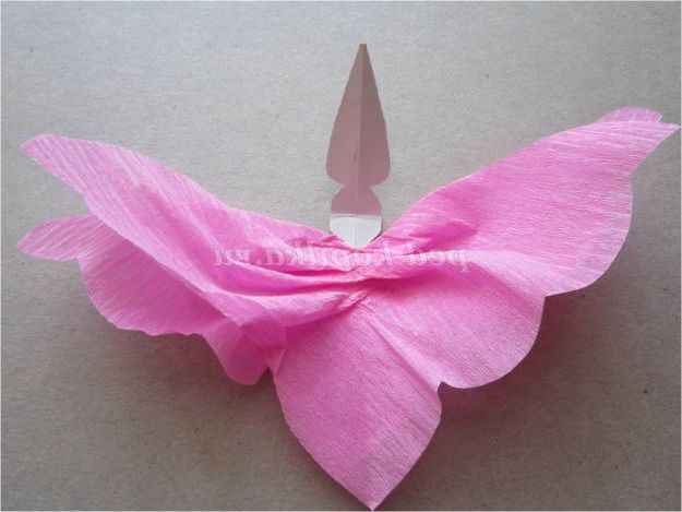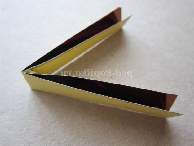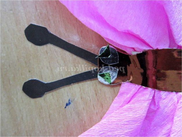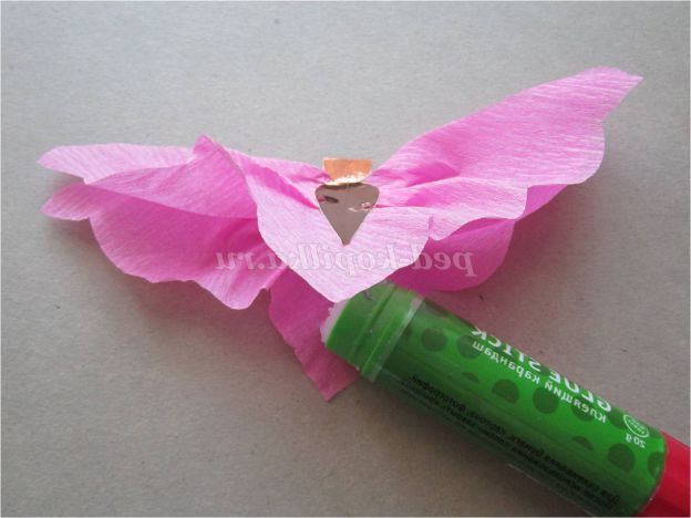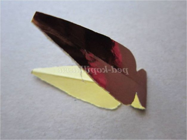 З рожевої фольги вирізаємо заготовку тулуба, як і в попередньому способі. Отклеиваем папір і закріплюємо крильця, розгорнувши куточки один від одного.