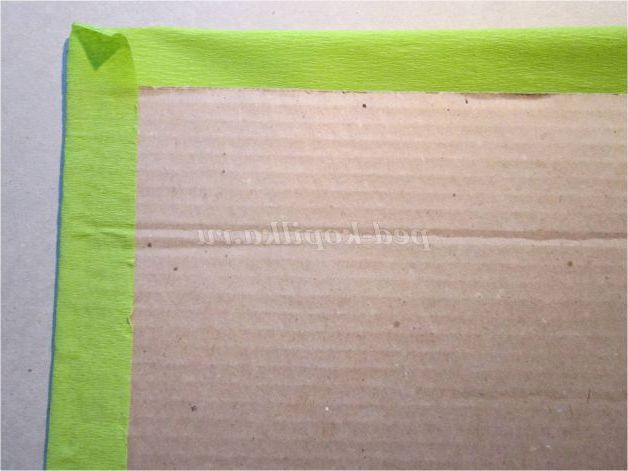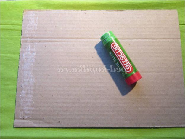 Тепер зробимо основу для нашого панно. Для фону візьмемо салатову гофрований папір (колір весняної трави) і картон. Закріплюємо краю паперу з виворітного боку, послідовно наносячи клей на краю картону.