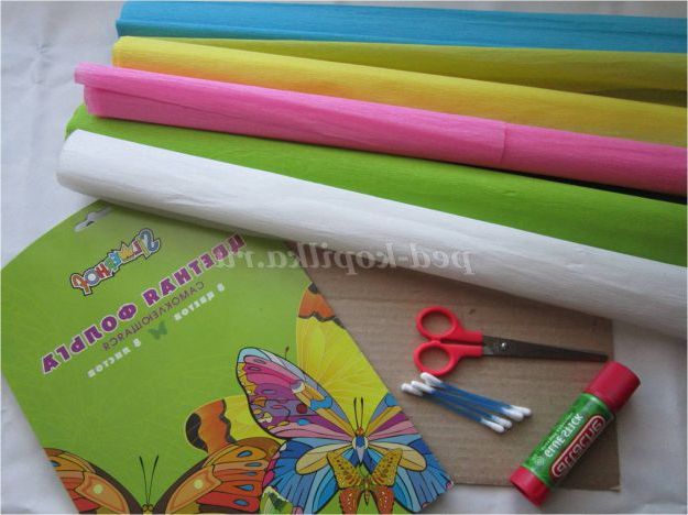 Матеріали: кольоровий гофрований папір, кольорова самоклеюча фольга, ножиці, клей, лист картону, ватні палички.