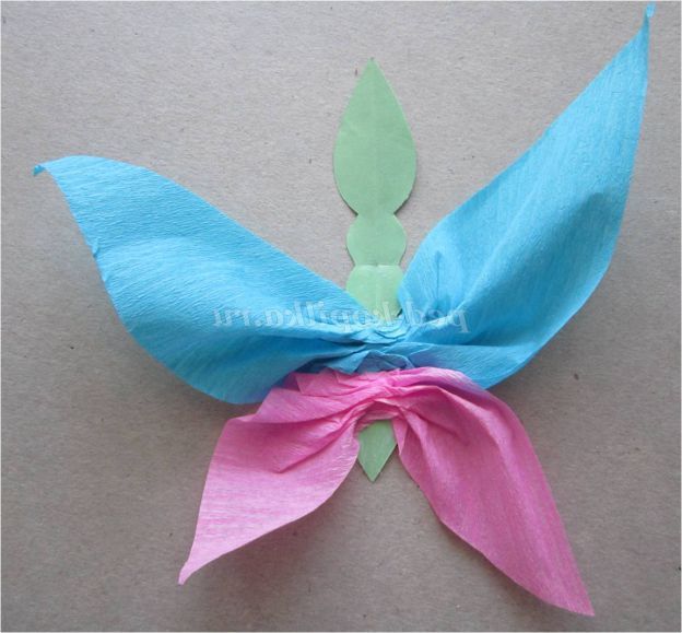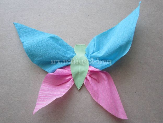 Візьмемо рожевий трикутник - це нижня крильце. Замяв його по центру, приклеюємо до низу черевця.