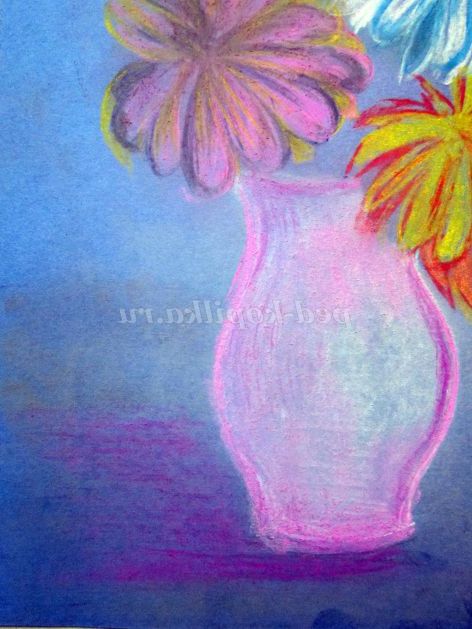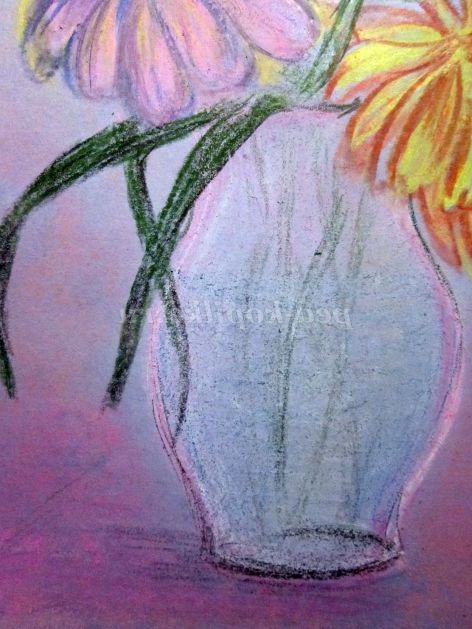 Надаємо вазі обсяг, використовуючи всі основні кольори пастелі, які задіяні в малюнку. Пальцем або за допомогою пензлика розтираємо штрихи. Під вазою бузковою пастеллю наносимо тінь.