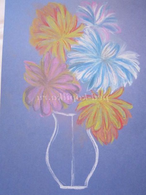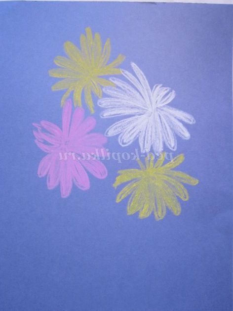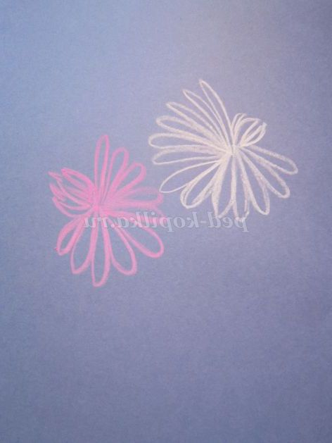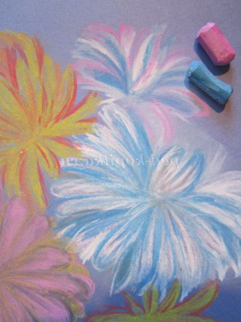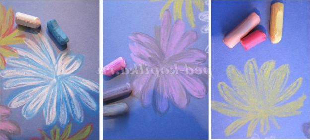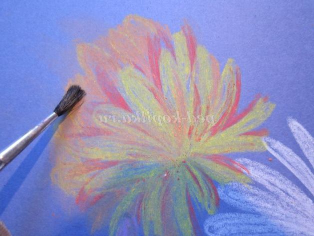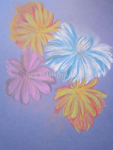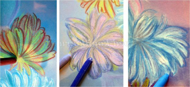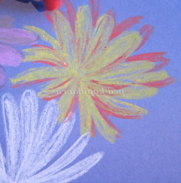 Для додання пелюсткам обсягу вводимо додаткові кольори пастельних крейди. Наприклад: до основного жовтого кольору додаємо помаранчевий колір і рожевий; в рожева квітка вводимо бузковий і жовтий; до основного білого кольору додаємо блакитний і темно-сірий кольори.