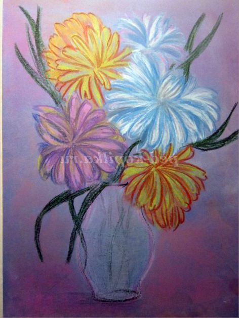 Особливістю сухої пастелі є те, що всі крейди містять звичайний білий крейда. Із за цього суха пастель не дозволяє отримати насичених кольором тіней. Для того щоб малюнок став яскравішим я пропоную використовувати воскові олівці. Для білої квітки використовуємо блакитний олівець. У рожева квітка вводимо колір синього і бузкового олівця і плавно підкреслюємо контури пелюсток. У жовтих айстрах контраст допоможе підкреслити восковий олівець кольору вохри червоної.