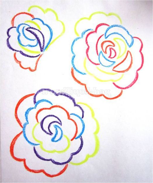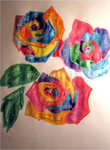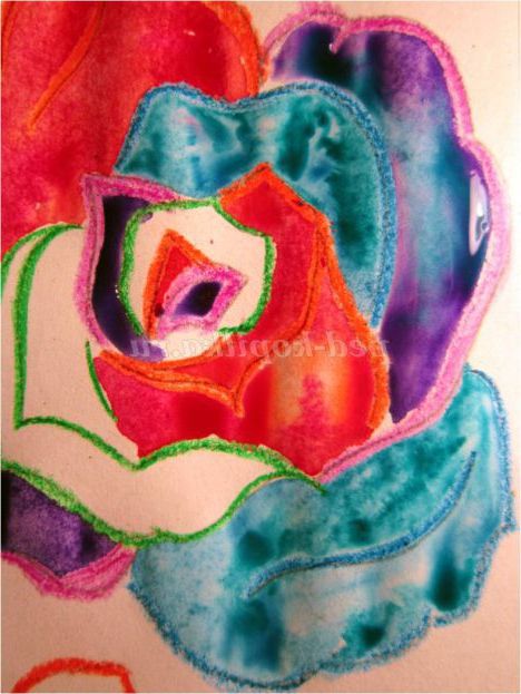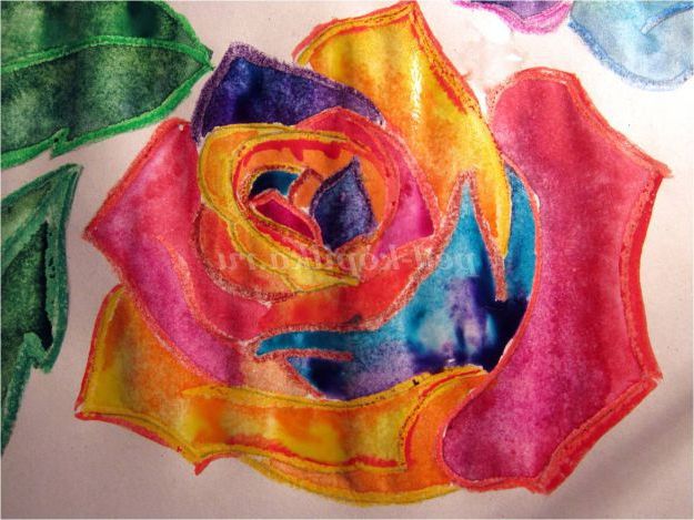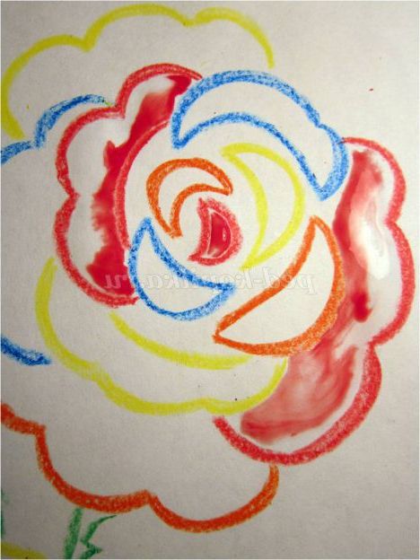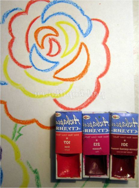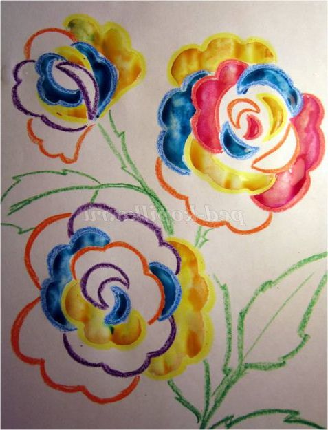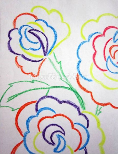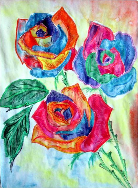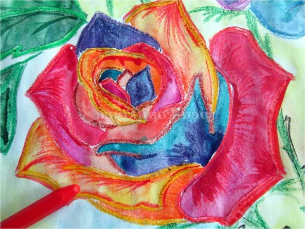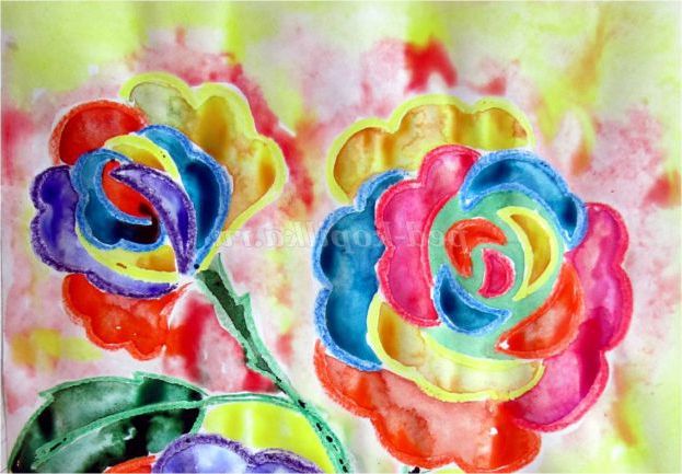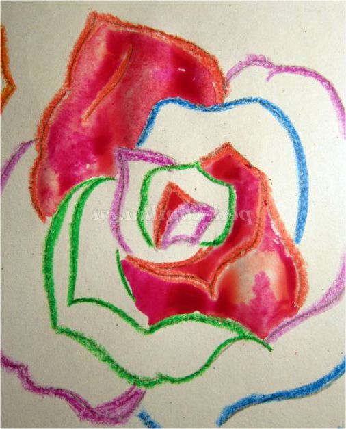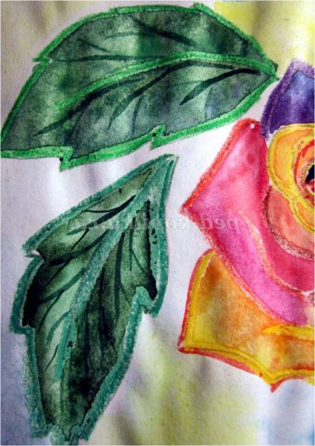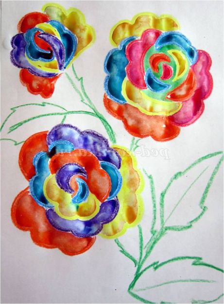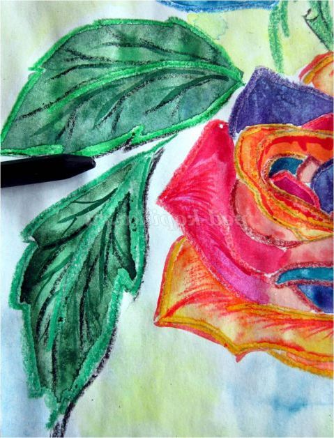 3) восковими олівцями, промальовуємо тіні і прожилки на листі й пелюстках троянд.
