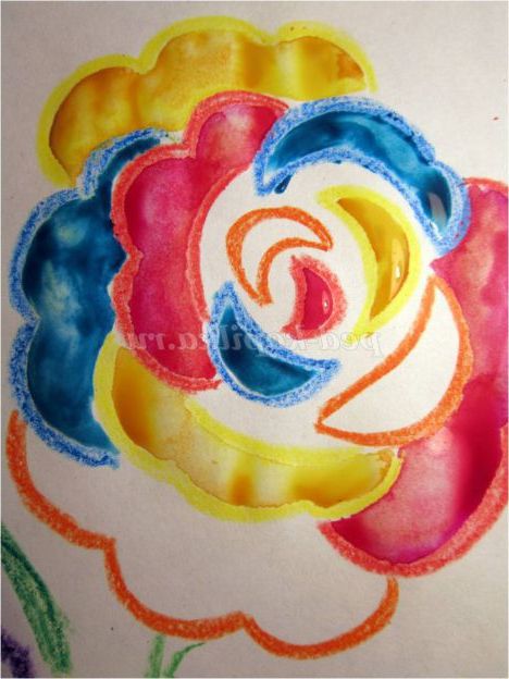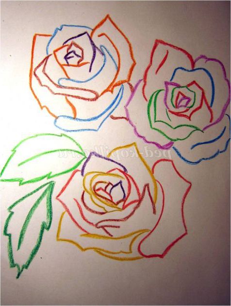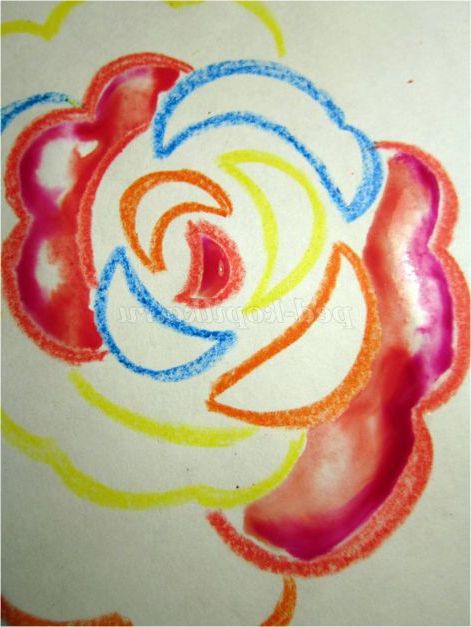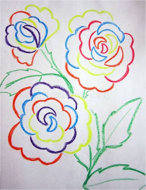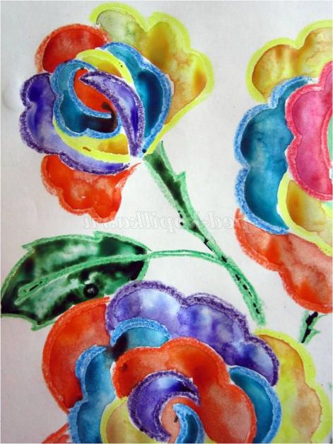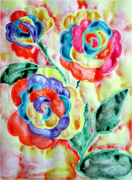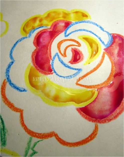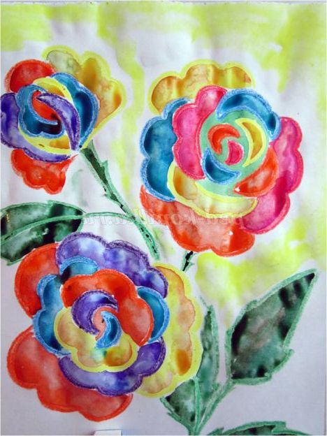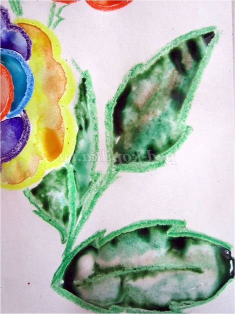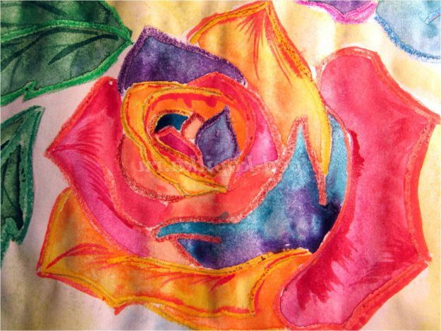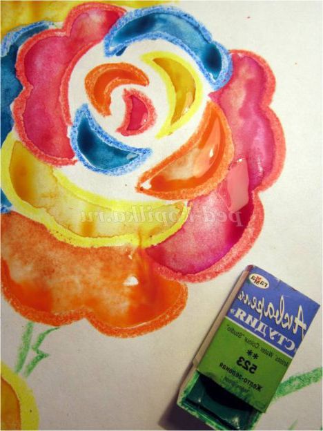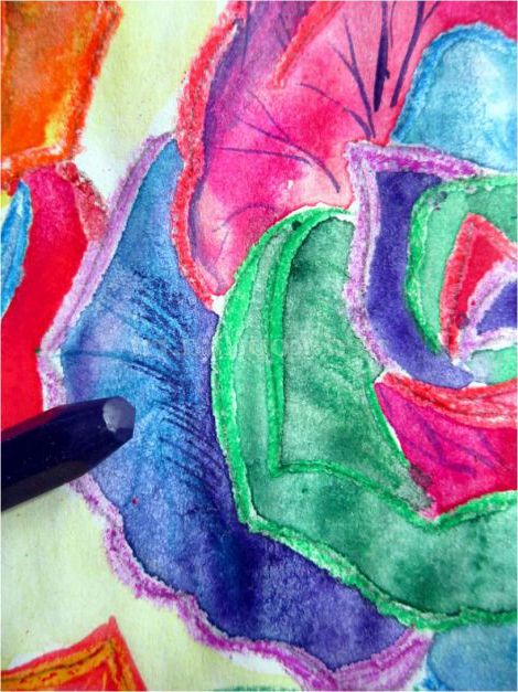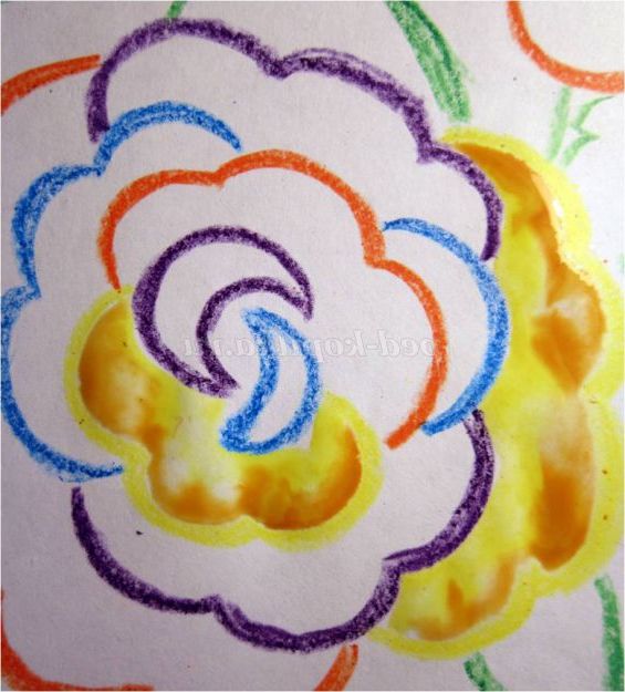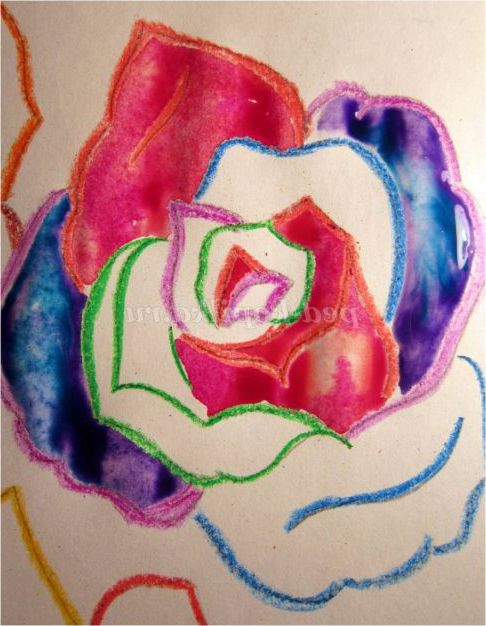 3) восковими олівцями, промальовуємо тіні і прожилки на листі й пелюстках троянд.
