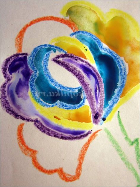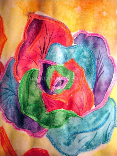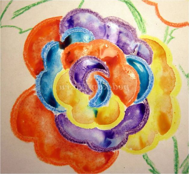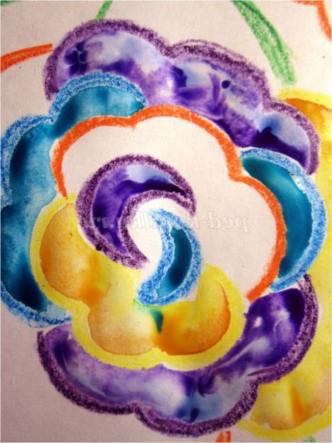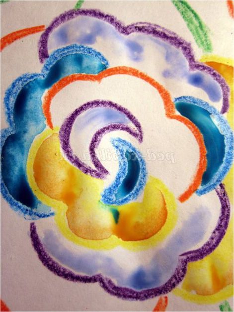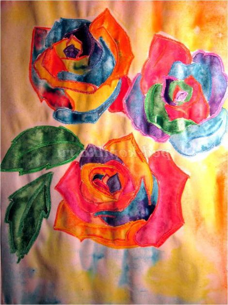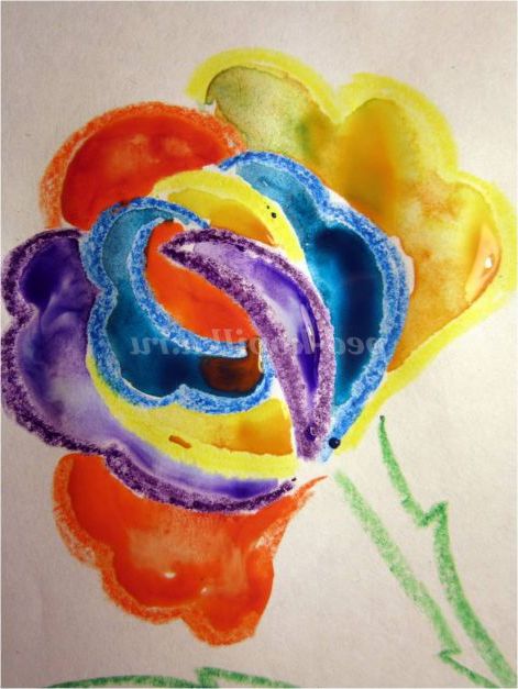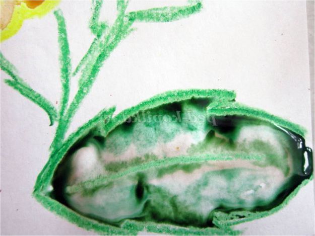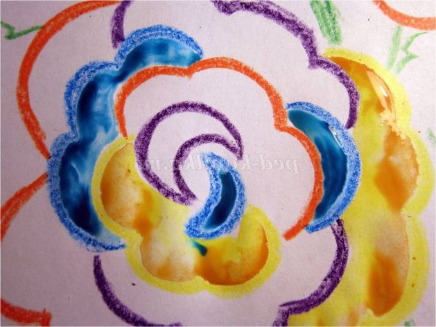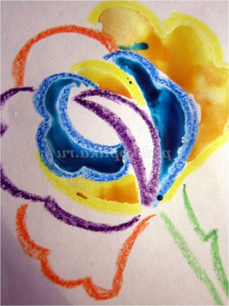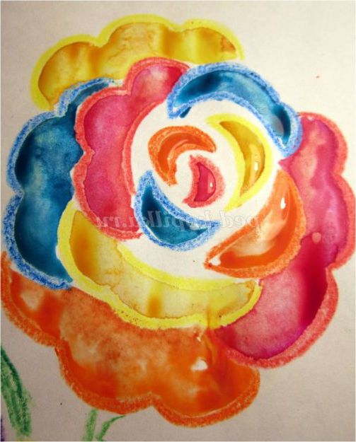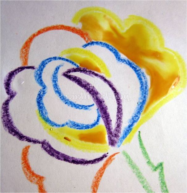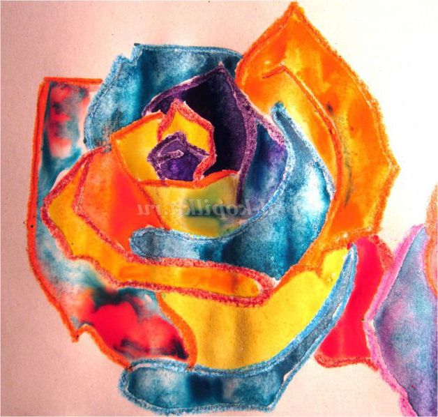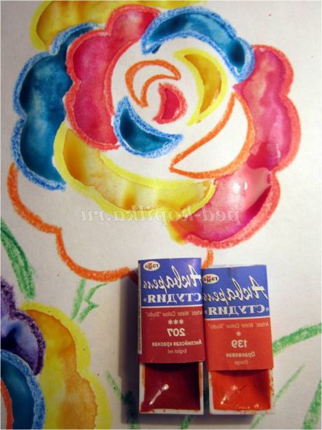 3) восковими олівцями, промальовуємо тіні і прожилки на листі й пелюстках троянд.