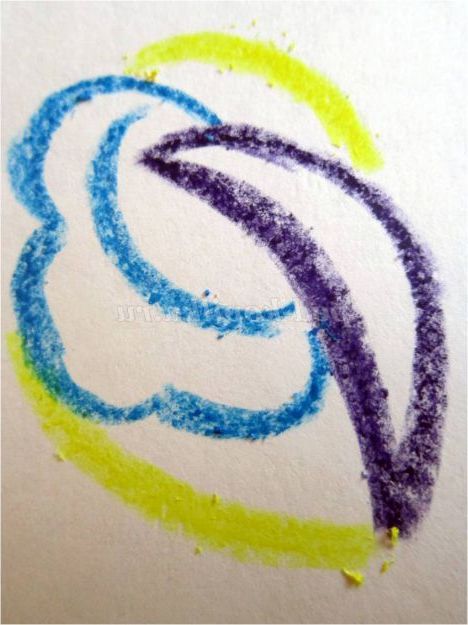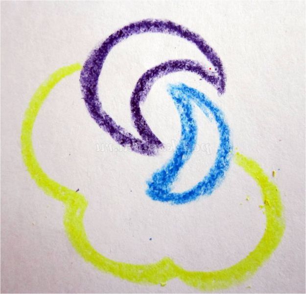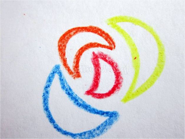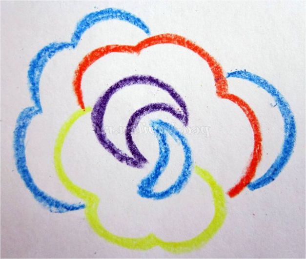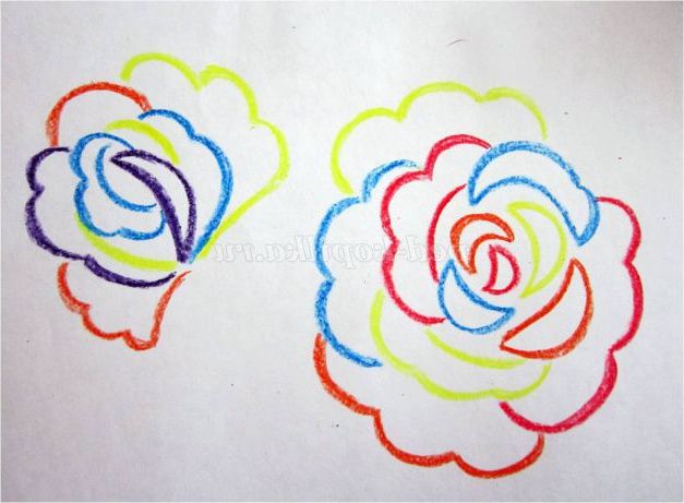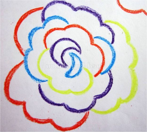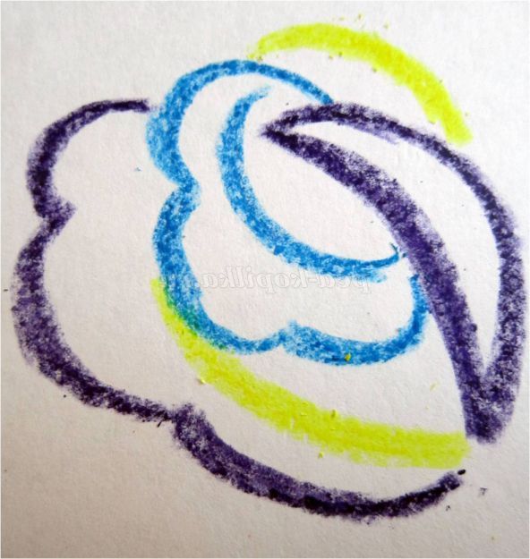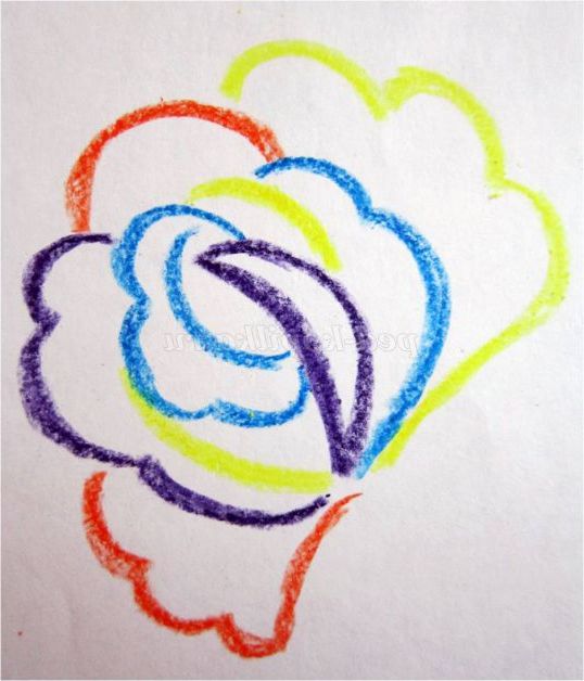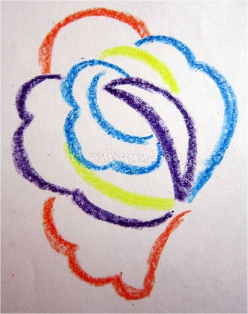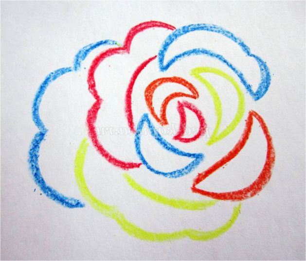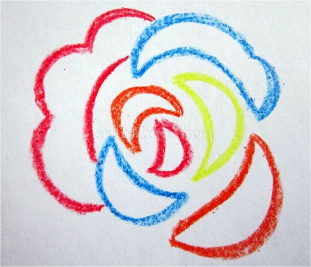Малювати ми будемо відразу кольоровими восковими олівцями, промальовуючи кожна пелюстка своїм кольором. Отже, почнемо. Для початку візьміть жовтий, блакитний, червоний і оранжевий олівці і намалюйте чотири хаотичних півмісяця, як показано на малюнку, - це будуть центральні пелюстки нашої троянди. Малюнок розташовуйте ближче до лівого краю у верхній частині аркуша.