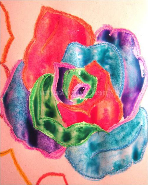 навчити малювати Райдужні троянди, використовуючи різні техніки: воскові олівці і акварель;