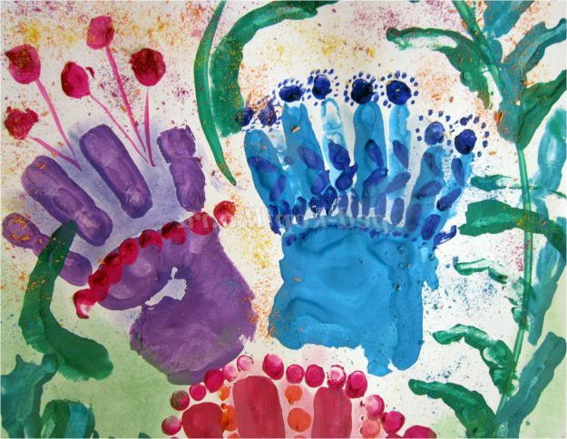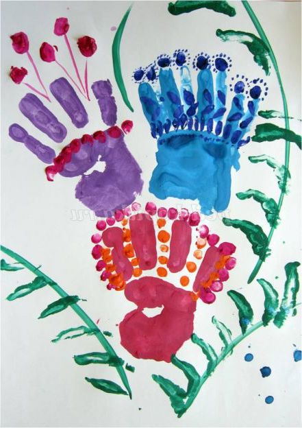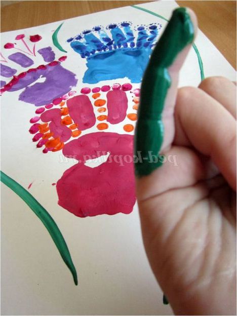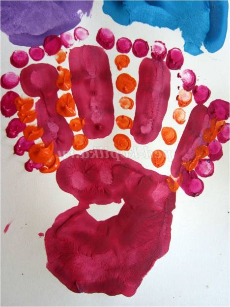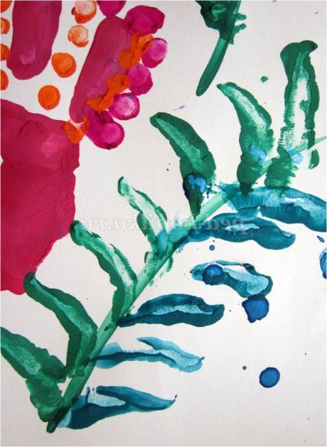 Якщо ви бажаєте отримати більш довгі листи, нанесіть фарбу на всю бічну поверхню долоні і мізинця, і тоді у вас з'являться ось такі красиві і цікаві відбитки.
