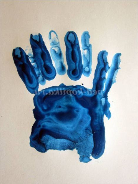 Наносимо фарбу на долоню і чотири пальці (всі, крім великого - таким чином, ми отримаємо потрібну нам форму «дзвони»). Для початку беремо синю гуаш.