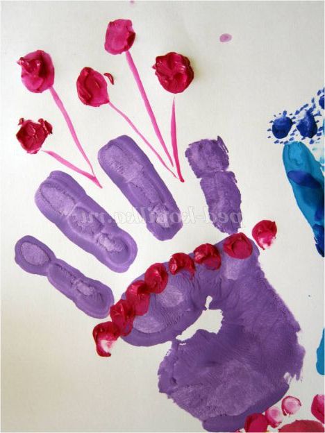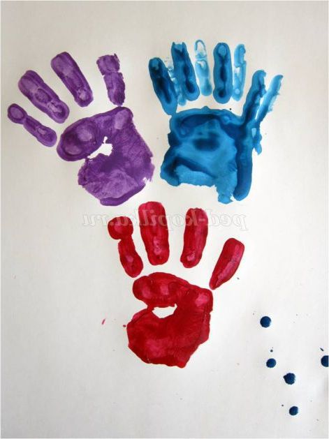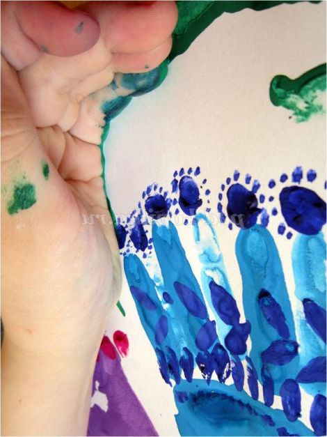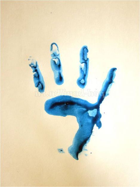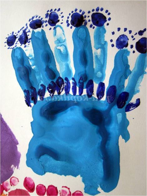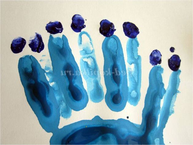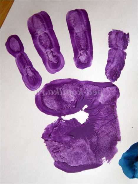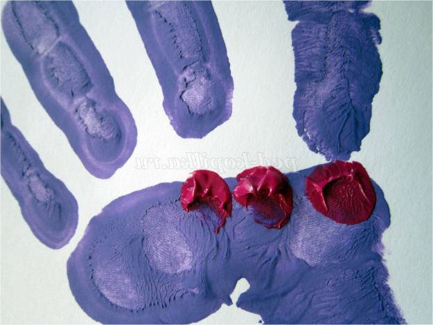 Нанесемо ще раз цю ж фарбу на долоню і чотири пальці, і поставимо відбиток, точно в попередній. Намагаємося потрапити пальчиками в проміжках попереднього відбитка.