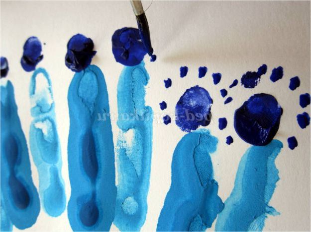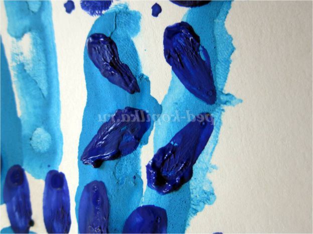 Переходимо до синього колокольчику. Синій гуашшю і все тим же вказівним пальцем ставимо вісім відбитків на кінчиках пальців.