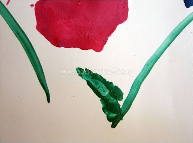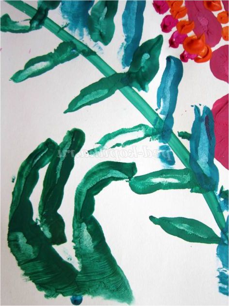 Продовжуємо ставити такі відбитки по всій довжині намічених раніше тонких лініях. Від того, яка кількість фарби знаходиться на мізинці залежить відбиток на аркуші паперу: світліше або темніше, товщина листа, його прозорість і так далі. Таким чином буде створюватися різна фактура листя, що важливо для композиції малюнка.