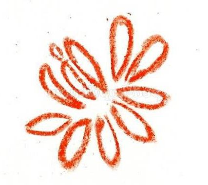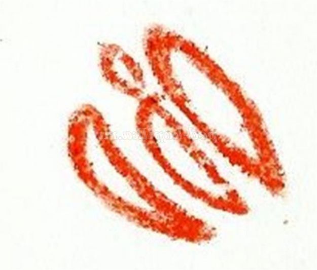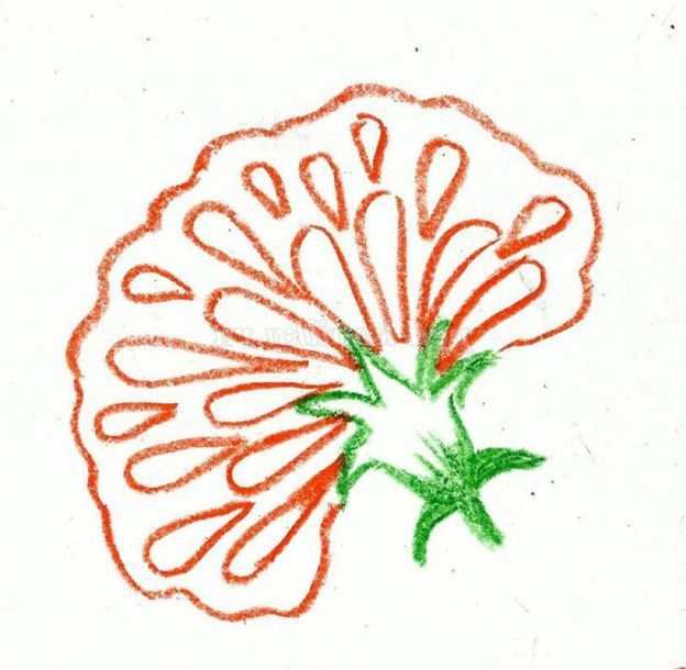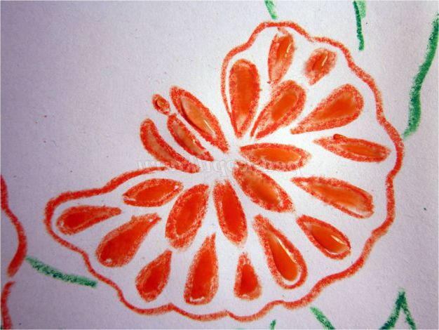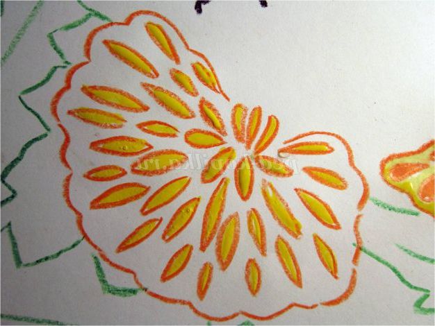 У лівому нижньому куті помаранчевим восковим олівцем малюємо кілька крапельок близько розташованих один до одного - це буде серединка нашої кошики.