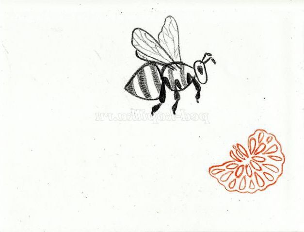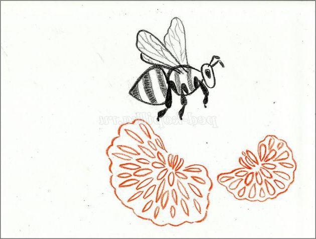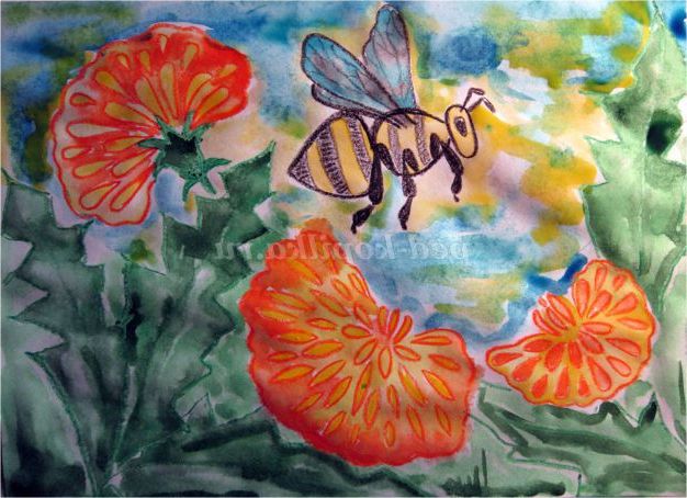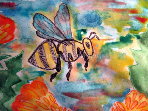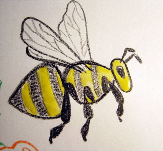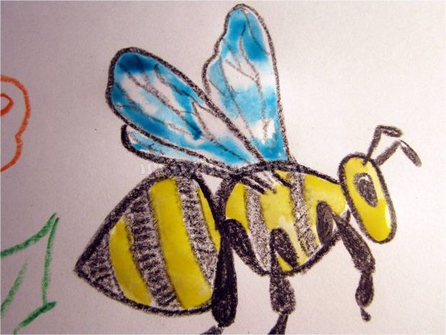 Жовтої аквареллю закрасимо тіло бджоли. Восковий олівець відштовхне фарбу і смужки залишаються чорними.
