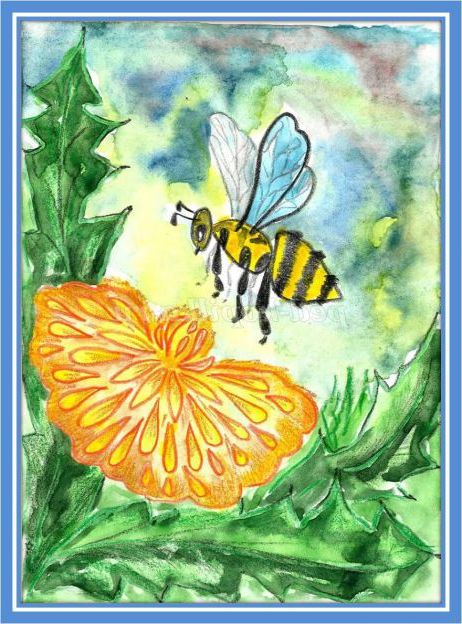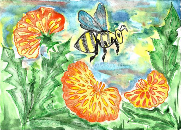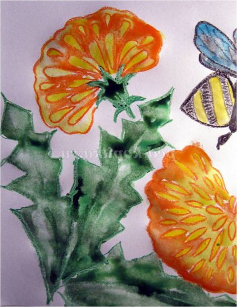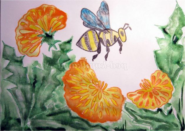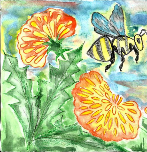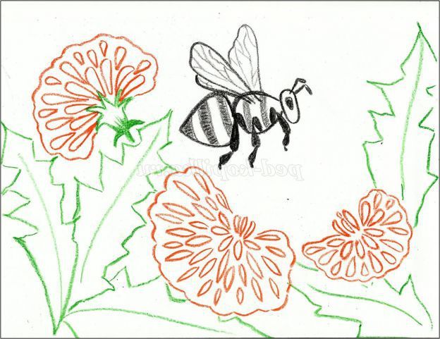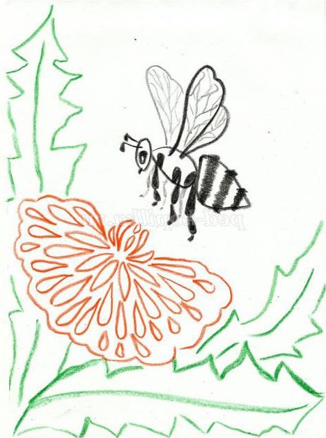 Завдання: розширити знання про кульбабі; виховувати емоційну чуйність на красу навколишньої природи; вчити передавати образ бджоли і квітки кульбаби, їх будову і форму; розвивати ритм і композицію, творчі здібності, уяву, фантазію; формувати емоційно - позитивне ставлення до самого процесу малювання.