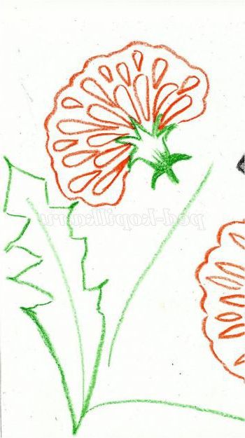 Малюємо квіти. Як ви напевно здогадалися це будуть кульбаби. Суцвіття кульбаби називається кошиком. Кошик кульбаби являє собою безліч дрібних квіток, густо розташованих на широкому загальному квітколоже.