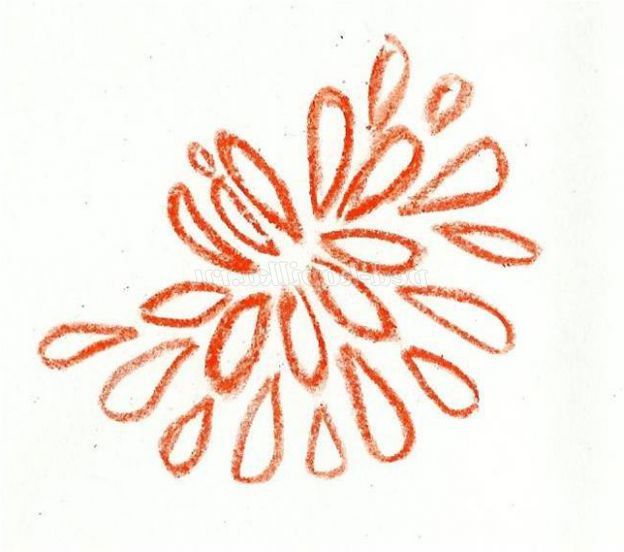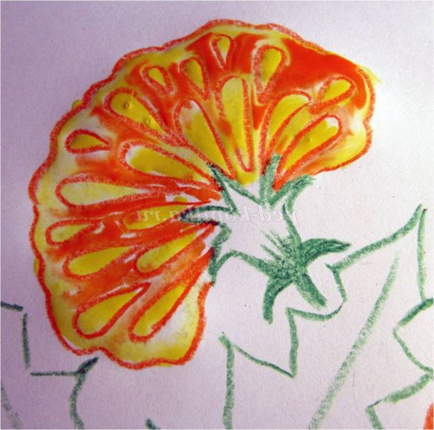 Помаранчевим олівцем підкреслимо край квітки і крапельки.