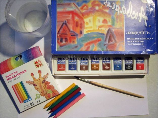 Матеріали: альбомний аркуш, кольорові воскові олівці, акварель, невелика пензлик, склянка для води.