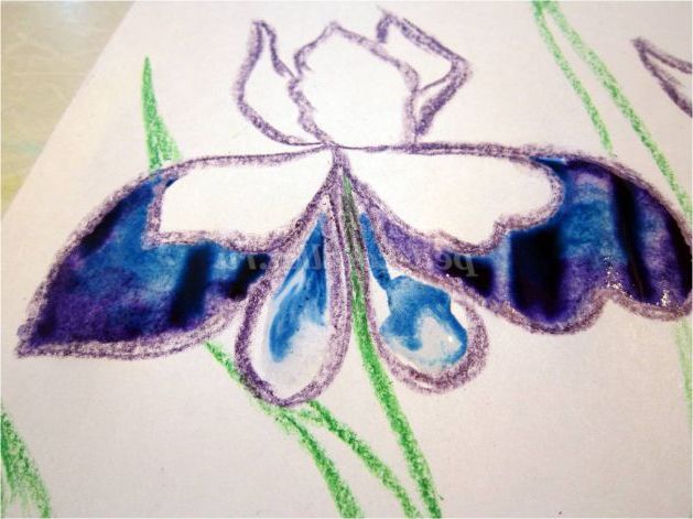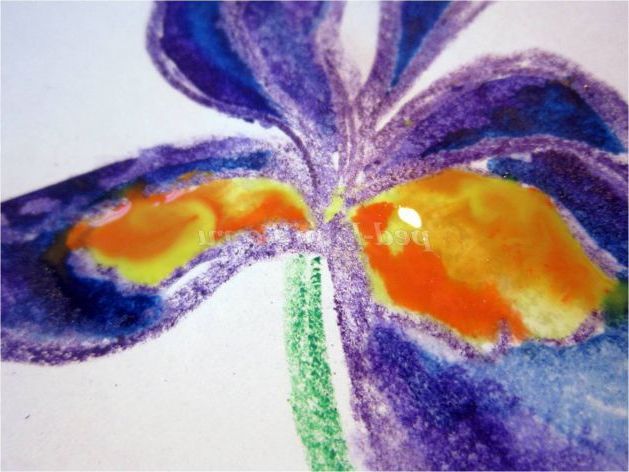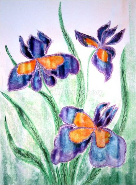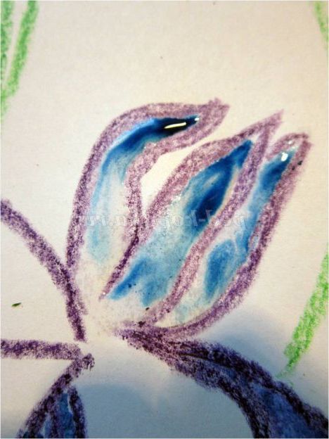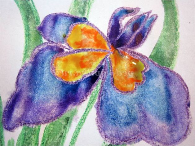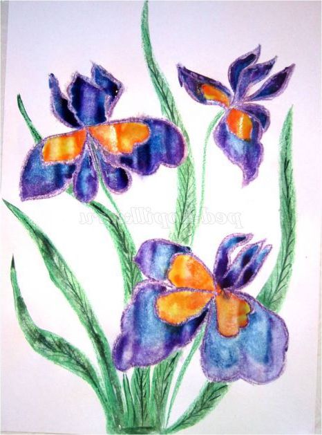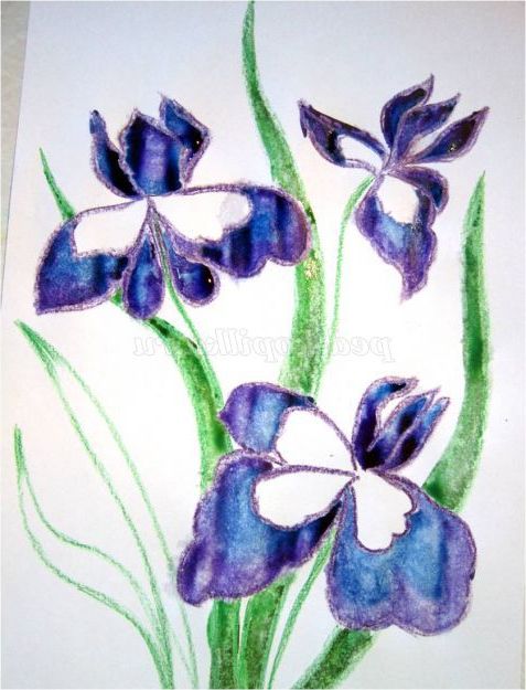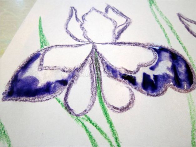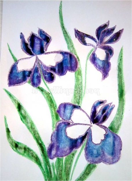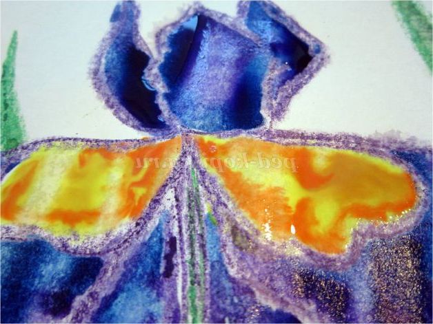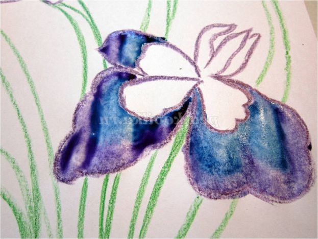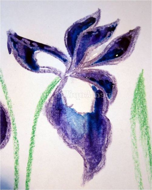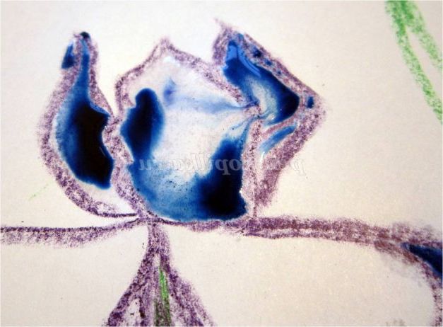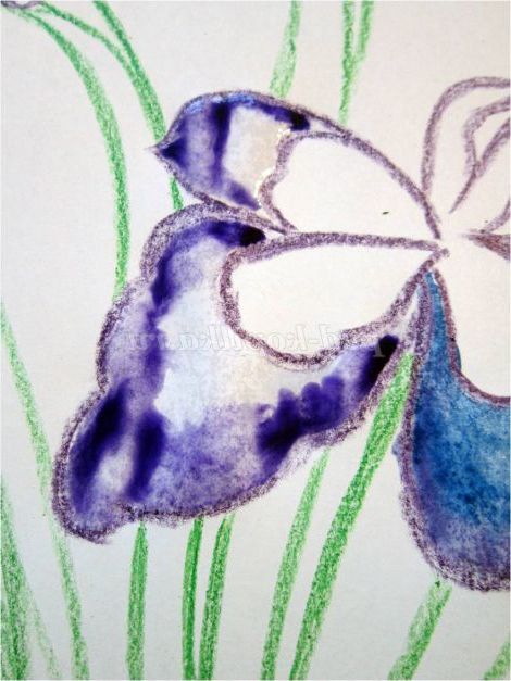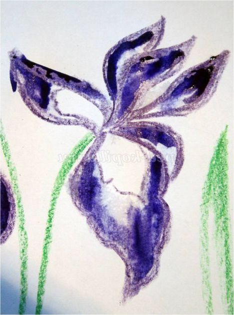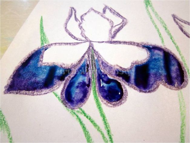 Тепер закріпіть лист на гладкій поверхні столу або скла по куточках скотчем, інакше лист буде деформуватися при роботі з фарбами. Використовуючи фіолетовий восковий олівець, починаємо обробку квіток ірису: на нашому малюнку їх буде три. (Для дітей молодшого шкільного віку можна запропонувати шаблон, а старші намалюють самі, особливо якщо попередньо опрацювати малювання форми пелюсток крейдою на дошці). Головне стежимо, щоб контур був виконаний товстою лінією - він не дозволить фарбі розтікатися.