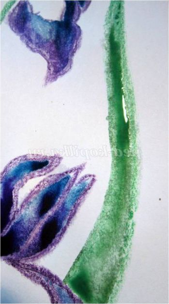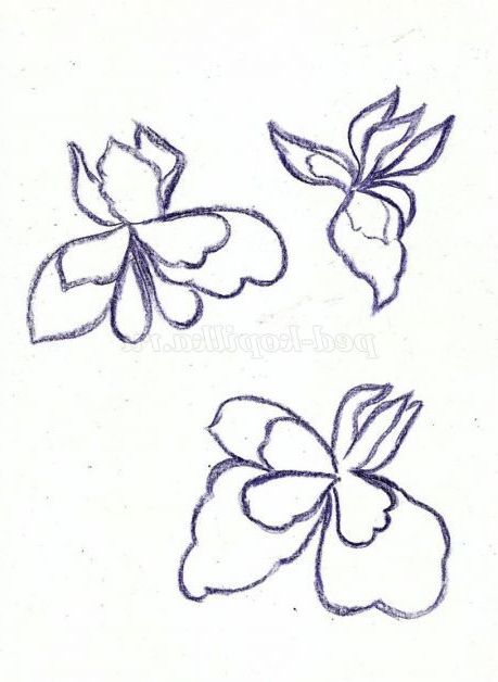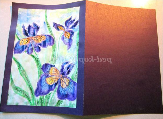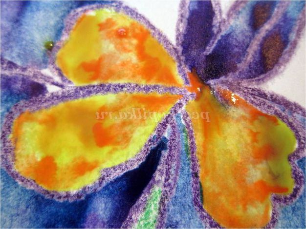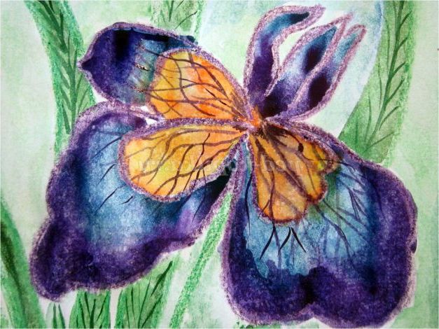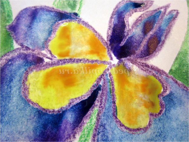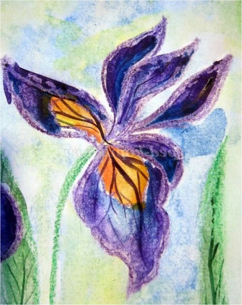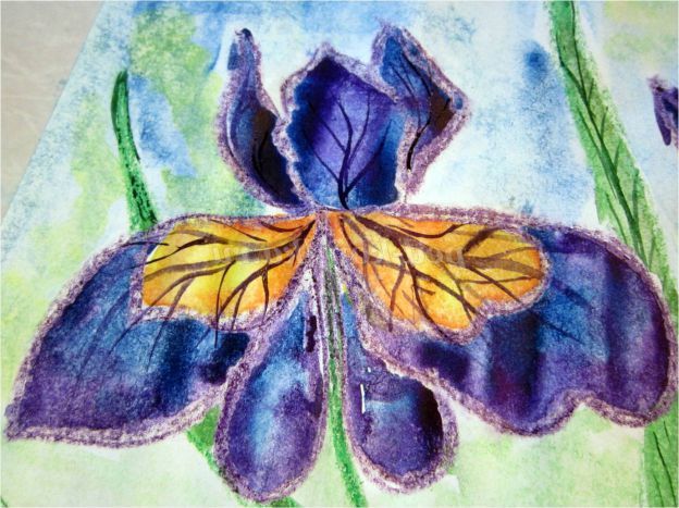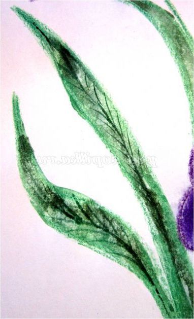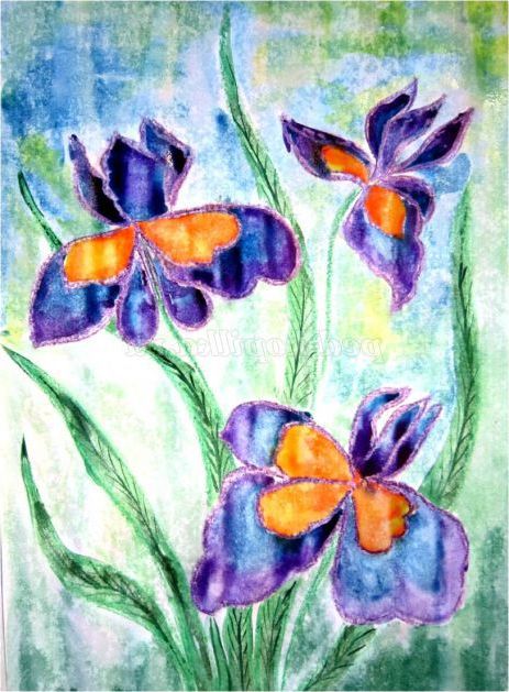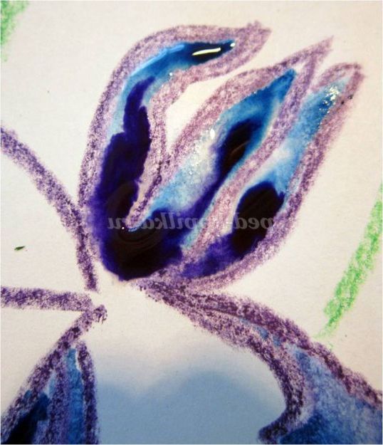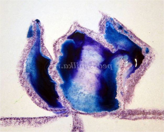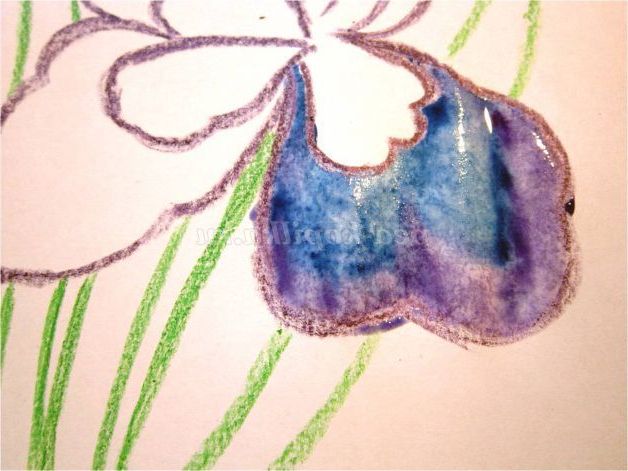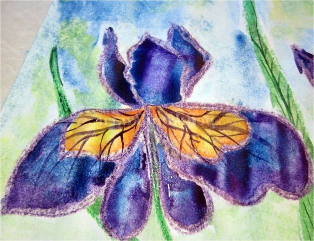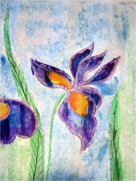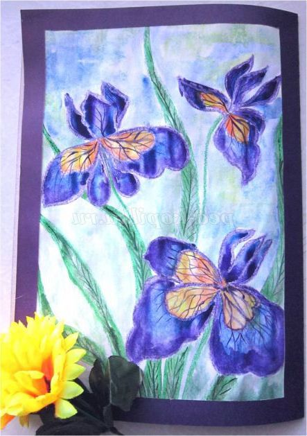 Тепер закріпіть лист на гладкій поверхні столу або скла по куточках скотчем, інакше лист буде деформуватися при роботі з фарбами. Використовуючи фіолетовий восковий олівець, починаємо обробку квіток ірису: на нашому малюнку їх буде три. (Для дітей молодшого шкільного віку можна запропонувати шаблон, а старші намалюють самі, особливо якщо попередньо опрацювати малювання форми пелюсток крейдою на дошці). Головне стежимо, щоб контур був виконаний товстою лінією - він не дозволить фарбі розтікатися.