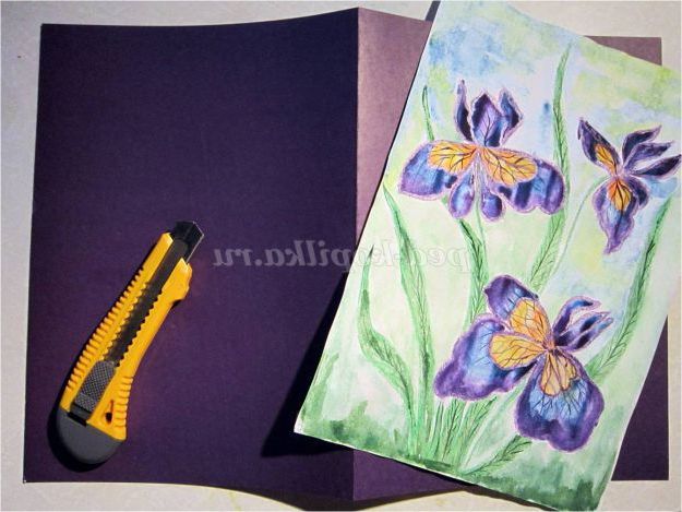 З рисунка можна зробити красиву листівку. Для її виготовлення нам знадобиться кольоровий картон (у мене він фіолетового кольору) формату А-3, канцелярський ніж, клей, білий аркуш паперу (А-3).
