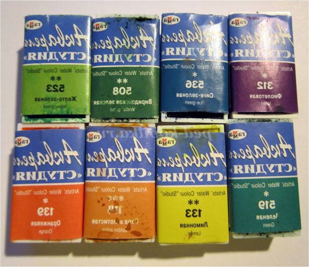 Покладіть поруч з собою кювети з аквареллю, які знадобляться нам для роботи: фіолетовий, синьо-зелена, вірідонова зелена, жовто-зелена, зелена, зелена, охра золотиста і помаранчева.
