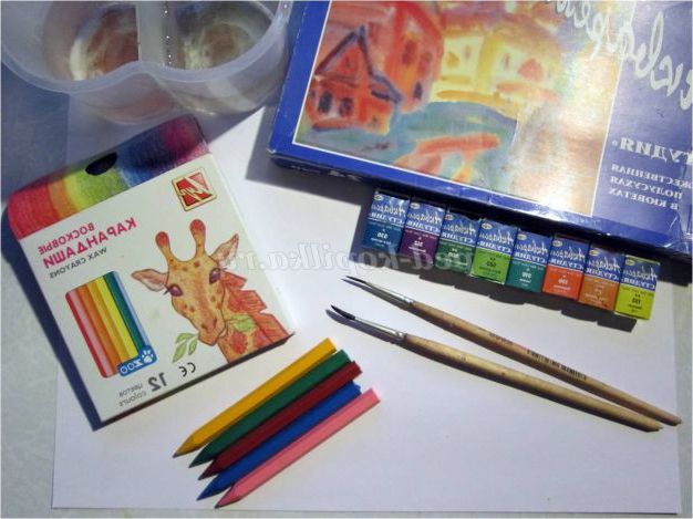 Приступимо до роботи. Для малюнка нам знадобляться: білий цупкий папір (краще акварельного); кольорові воскові олівці, акварель (я використовую художню напівсуху в кюветах, набір «Студія» 24 кольори); дві пензлика: поні або білка № 1 і № 2; подвійний стакан-непроливайка для води.