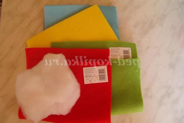 - фетр трьох кольорів рис.1(2 клаптя різних кольорів розміром 12*12 див. - це основа іграшки і маленький шматок жовтого кольору розміром 4*3 див. для личка іграшки);
