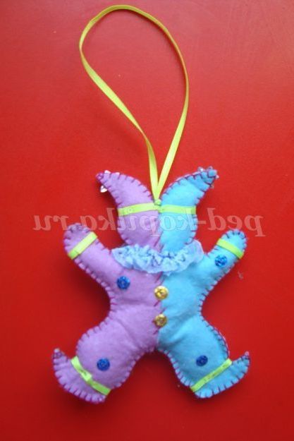 Вирізаємо особа «Петрушці» з фетру жовтого кольору, клеїмо оченята, носик. Пришиваємо намистини-гудзики. З вузької стрічки робимо петельку для іграшки, з тасьми комірець. На ковпак, костюм іграшки клеїмо паєтки.