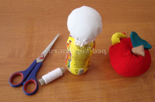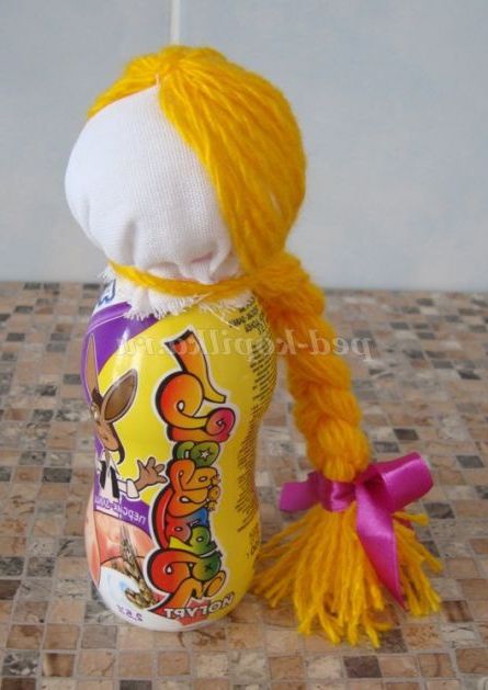 Крок 5. Голову ляльки закріплюємо на основу: одягаємо на горлечко пляшки, стягаємо щільно нитка, робимо по колу кілька стібків, щоб голова щільніше прилягала до основи.