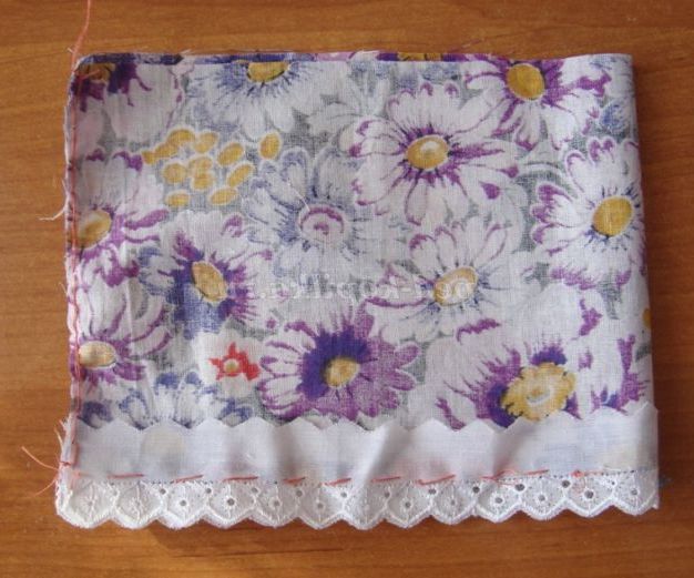 Крок 9. Для сарафана нам знадобиться яскравий шматок х/б тканини довжиною 40 см, висотою, в залежності від висоти ляльки (основи - пляшечки) від 12 див., шиття або тасьма довжиною 40 див.