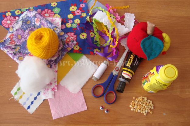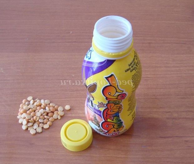 Крок 1. У наперед підготовлену основу ляльки, (пляшечку з під йогурту з закручується кришкою, тара повинна бути чистою і сухою), насипати горох або іншу крупу - 1 ст. ложку, закручуємо кришку. Лялька стане більш стійкою, а ще вона буде видавати гримлячий звук, зовсім як справжня брязкальце.