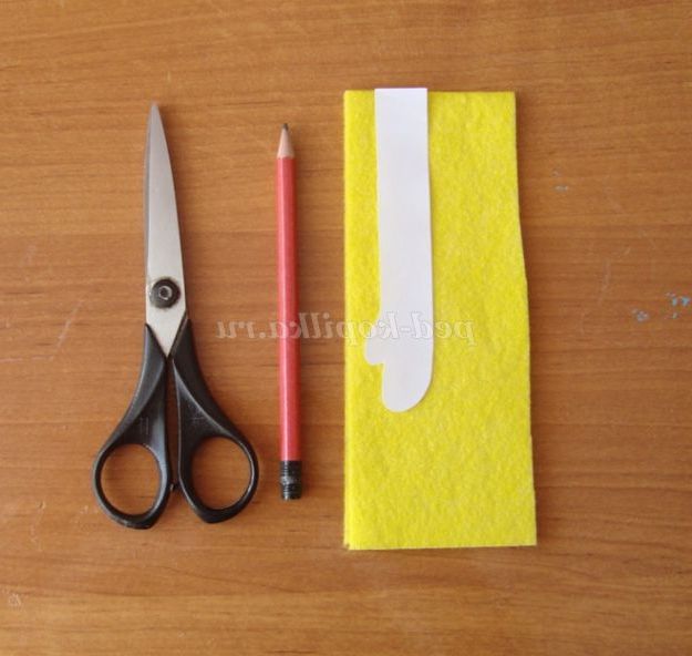 Крок 16. З жовтого фетру або віскозної серветки вирізаємо ручки - 2 деталі, довжиною - 9 див, шириною 2 див, як показано на фото.