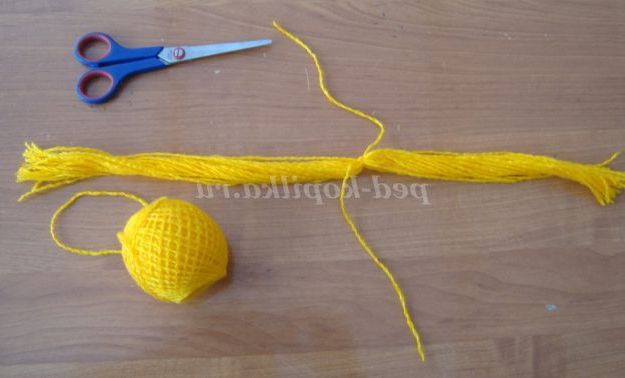 Крок 6. З жовтою або помаранчевою пряжі робимо косу: формуємо пучок ниток довжиною 40 см, перев'язуємо його навпіл ниткою.
