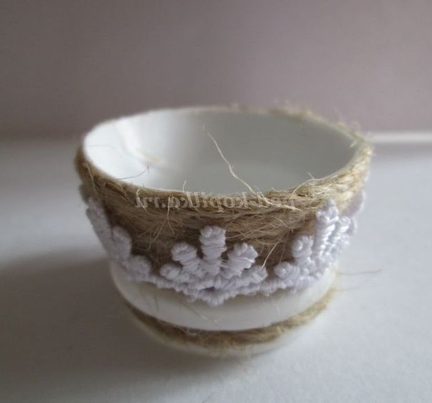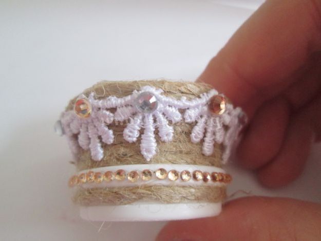 Я "облягла" підставочку джутової ниткою, прикрасила мереживом і стразами.